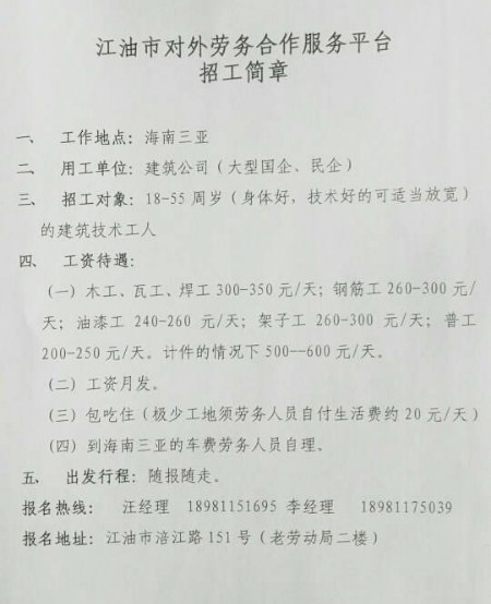 | 江油市對外勞務(wù)招工簡章 | 10 | 海南三亞 |